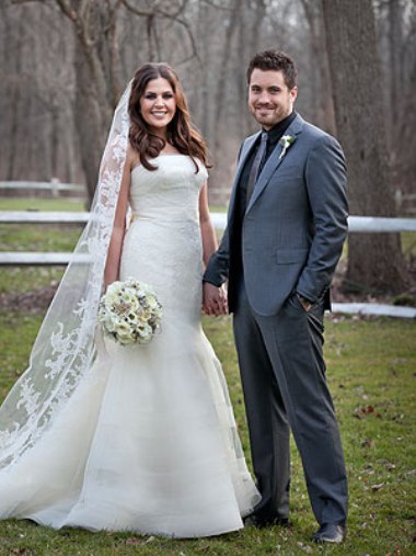 the bride looked beautiful with a fab mermaid lace dress from Vera Wang and a long cathedral veil